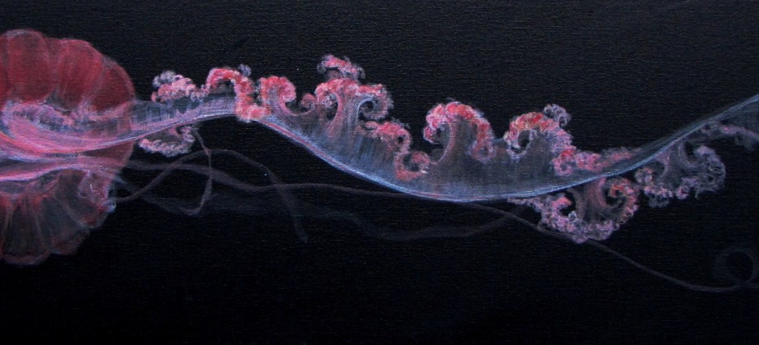 The painting above is based on the magnificent South American Sea Nettle (Chrysaora plocamia), and you may notice that the arms of the jellyish are incomplete, as I only had time to paint one. I was absolutely captivated by the elaborate fractal patterns of the arms, and their translucency, which reminded me of tendrils of smoke. (For anyone wondering, yes I do mean arms, not tentacles! The tentacles are the narrower string-like appendages. Those interested can find a crash course on jelly anatomy here.)