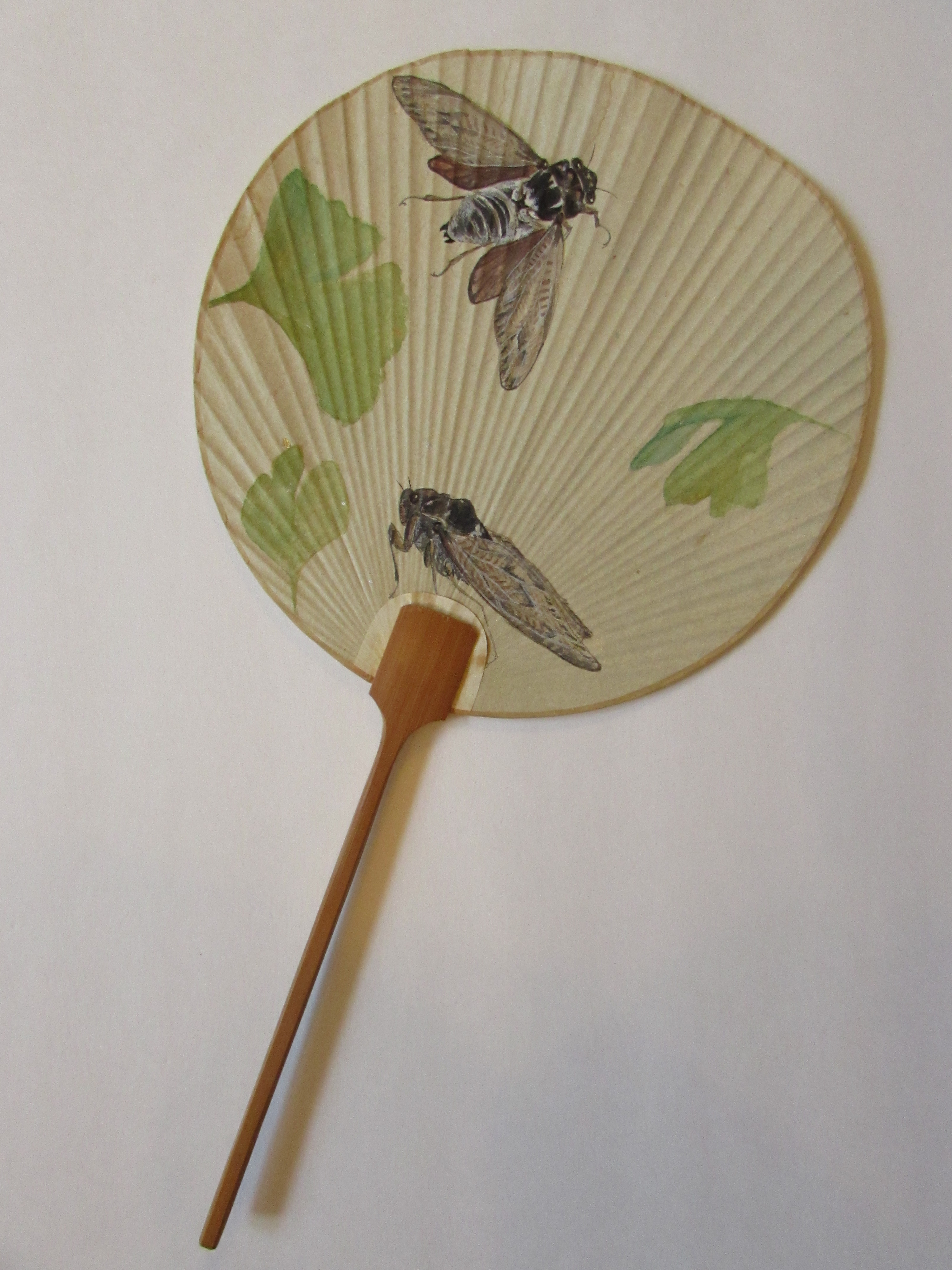 I painted this uchiwa during a month-long stay in Kyoto in August. Japanese summers are oppressively hot and muggy, especially in Kyoto, where there is seldom a breeze to offer relief and central air conditioning is a rarity. Nearly everyone carries a fan to keep cool, so I painted this one for practical use and as a tribute to one of my favorite invertebrates. These cicadas are Graptopsaltria nigrofuscata, called aburazemi in Japanese. They are quite large.