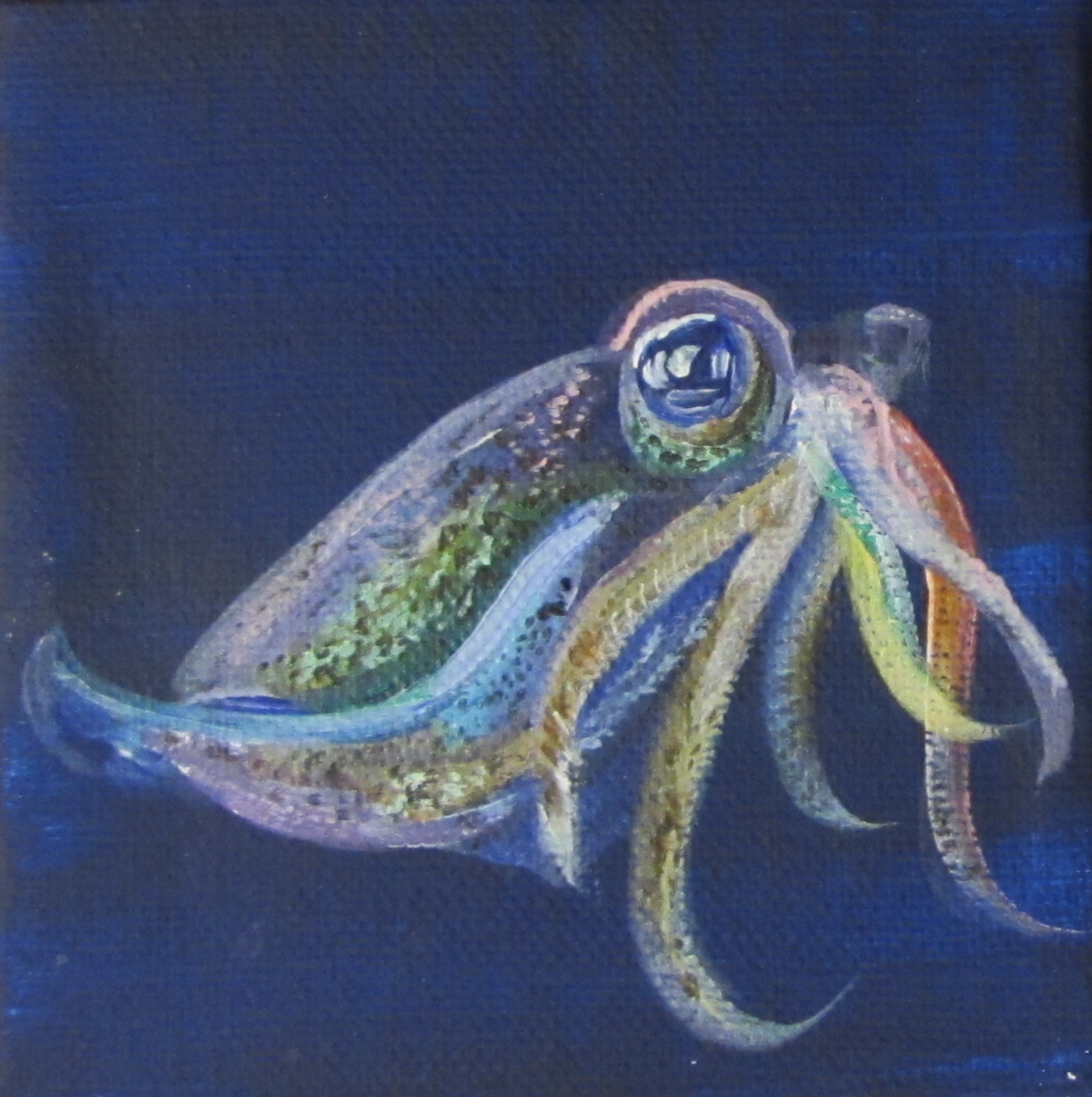 Rainbow Cuttlefish, 2016 Acrylic on canvas, 4″x4″This is a somewhat fanciful rendering of a cuttlefish, who can express their emotions through color change by selectively opening and closing special pores on their skin.