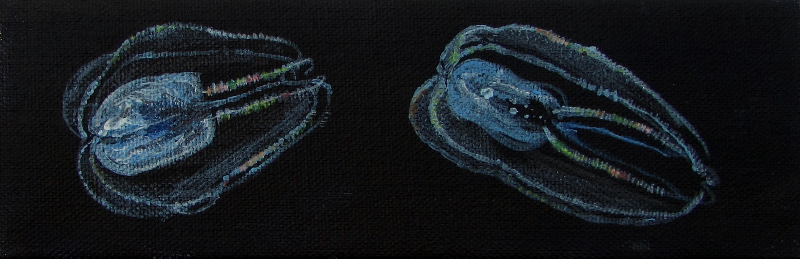 LOBED COMB JELLIES, 2016 Acrylic on canvas, 3″x9″When I lived in Massachusetts, these perfectly harmless comb jellyfish were a common sight in the waters near my home. Although so clear as to be almost invisible in daylight, the light reflecting off of their cilia made ever-changing rainbow patterns.
